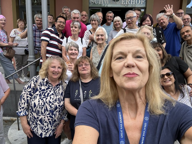 Selfie by Jane our tour manager of all of us outside the hotel.